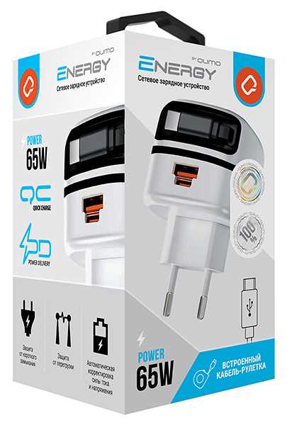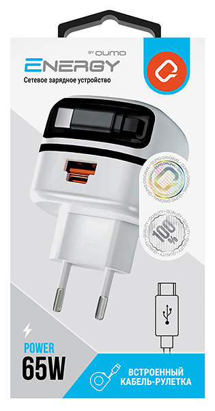 СЗУ Qumo Energy PD 65Вт (Charger 0091), USB-A QC3.0 + 2 USB Type-C PD (один встр., кабель), цвет белый