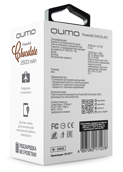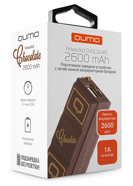 Компактный аккумулятор Qumo PowerAid 2600 Choco, выполнен в форм-факторе шоколдки и поставляется в яркой "шоколадной" упаковке. Емкости в 2600 мА-ч хватит для зарядки аккумулятора смартфона на 60-70% (средние значения в зависимости от модели смартфона). Корпус выполнен из негорючего, ударопрочного пластика и позволяет использовать аккумулятор кадждый день.
